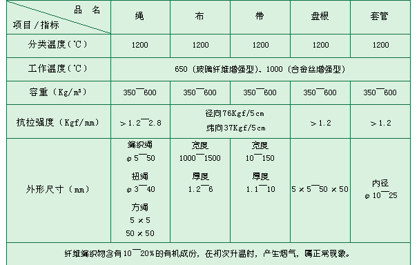 產(chǎn)品簡介】 硅酸鋁(陶瓷)耐火纖維編織品是以硅酸鋁(陶瓷)耐火纖維為原料,加入適量玻璃纖維或耐火合金絲等不同的增強材料,經(jīng)過編織工藝制成的編織品。 【產(chǎn)品類型】 硅酸鋁(陶瓷)耐火纖維編織繩、布、帶、扭繩、盤根、套管等。 【產(chǎn)品性能】 ※耐高溫、低熱容、導(dǎo)熱系數(shù)低、抗熱震 ※具有抗熔融鋁、鋅等有色金屬侵蝕能力 ※優(yōu)良的高溫絕緣性能、使用壽命長 ※無毒、無害,對環(huán)境無不良影響 ※施工安裝方便 【最高使用溫度】 產(chǎn)品的最高使用溫度取決于材料的使用條件。 【應(yīng)用范圍】 ◎各種窯爐、高溫管道及容器隔熱保溫 ◎冶金、玻璃、航天、建材、船舶行業(yè)的隔熱層、隔熱墊 ◎電子、化工、汽車、建材行業(yè)的防火簾、消音器材 ◎爐門、閥門、法蘭密封、防火門及防火卷簾材料 ◎高溫爐門幕簾 【供貨規(guī)格和包裝】 各類耐火纖維編織品均以紙箱或編織袋包裝發(fā)運(特殊包裝可根據(jù)客戶需求定做)。